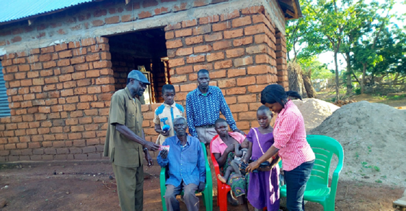 Diwani wa kata ya Nyamrandirira Ruteli Maregesi (aliyesimama kushoto) na msaidizi wa mbunge wa Jimbo la Musoma vijijini Verdiana Mgoma (wa kwanza kulia), wakikabidhi misaada ambayo iliahidiwa na mbunge Prof. Sospeter Muhongo kwa familia ya Nyambita Nyambea wakazi wa kijiji cha seka.