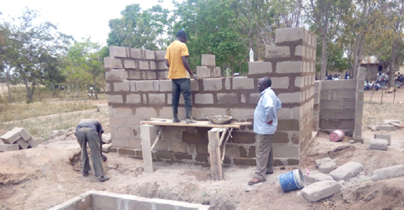 Mafundi wakiendelea na shughuli za ujenzi wa choo cha walimu katika shule ya msingi Busamba ikiwa ni sehemu ya mwendelezo wa matumizi ya mifuko 60 ya saruji iliyotolewa na Mbunge wa Musoma vijijini Prof. Sospeter Muhongo shuleni hapo. Kulia ni Maisha Tengeja, mwalimu wa shule ya msingi Busamba.