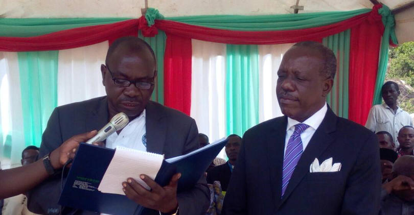 Mratibu wa mradi wa ujenzi wa kituo cha afya Nyambono Dkt. Majura Songo (kushoto) akisoma taarifa ya mradi huo. Kulia ni mbunge wa jimbo la Musoma vijijini Prof. Sospeter Muhongo ambaye alikuwa mgeni rasmi kwenye hafla hiyo, akifuatilia kwa makini taarifa hiyo.