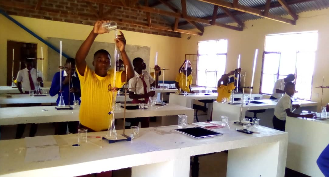 Wanafunzi wa Kiriba Sekondari wakiwa wanafanya mazoezi kwenye Maabara yao ya Kemia (Chemistry practical class)