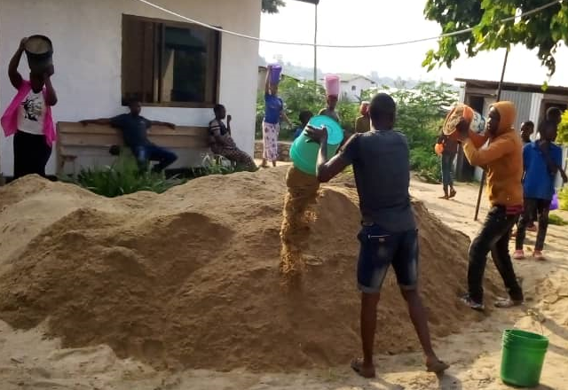 WAKAZI wa KISIWA cha RUKUBA wakisomba MCHANGA kwa ajili ya ujenzi wa MIUNDOMBINU ya KITUO chao cha AFYA.